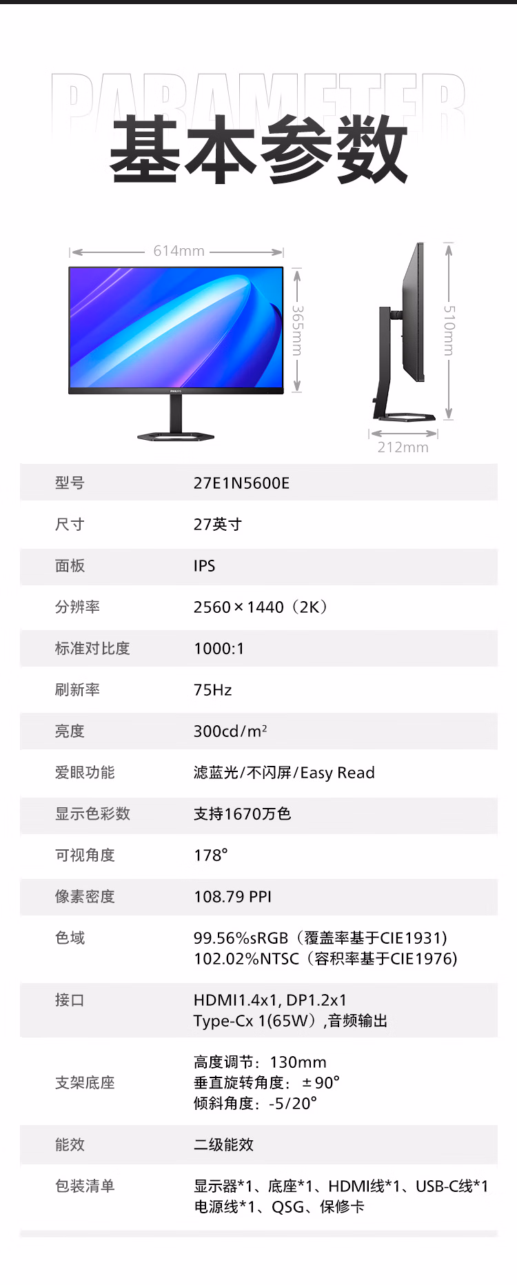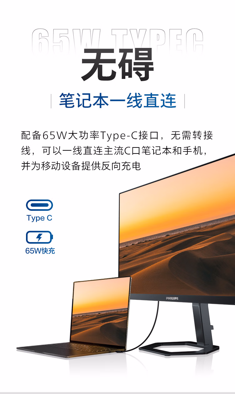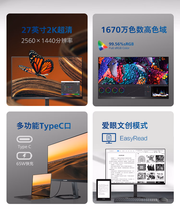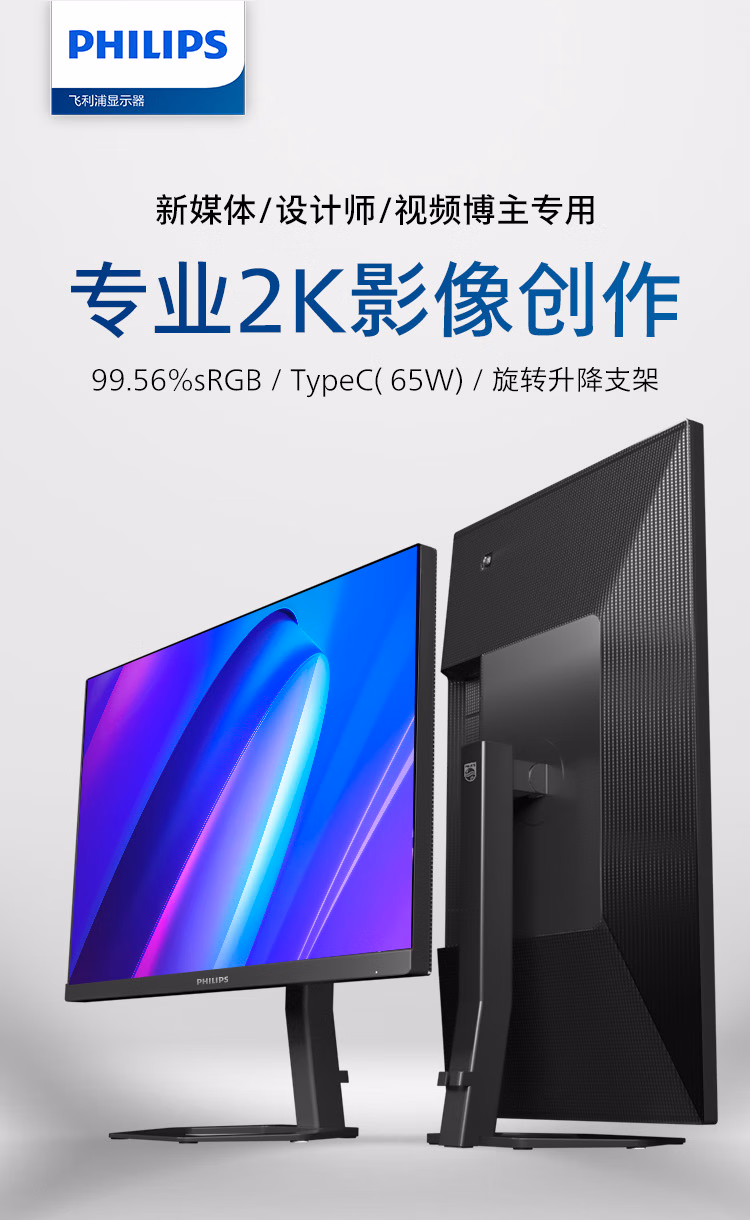 飞利浦 27英寸 2K IPS Type-C65W投屏 高色域 护眼低蓝光 旋转升降 设计办公显示器 娱乐显示屏 27E1N5600E 自营