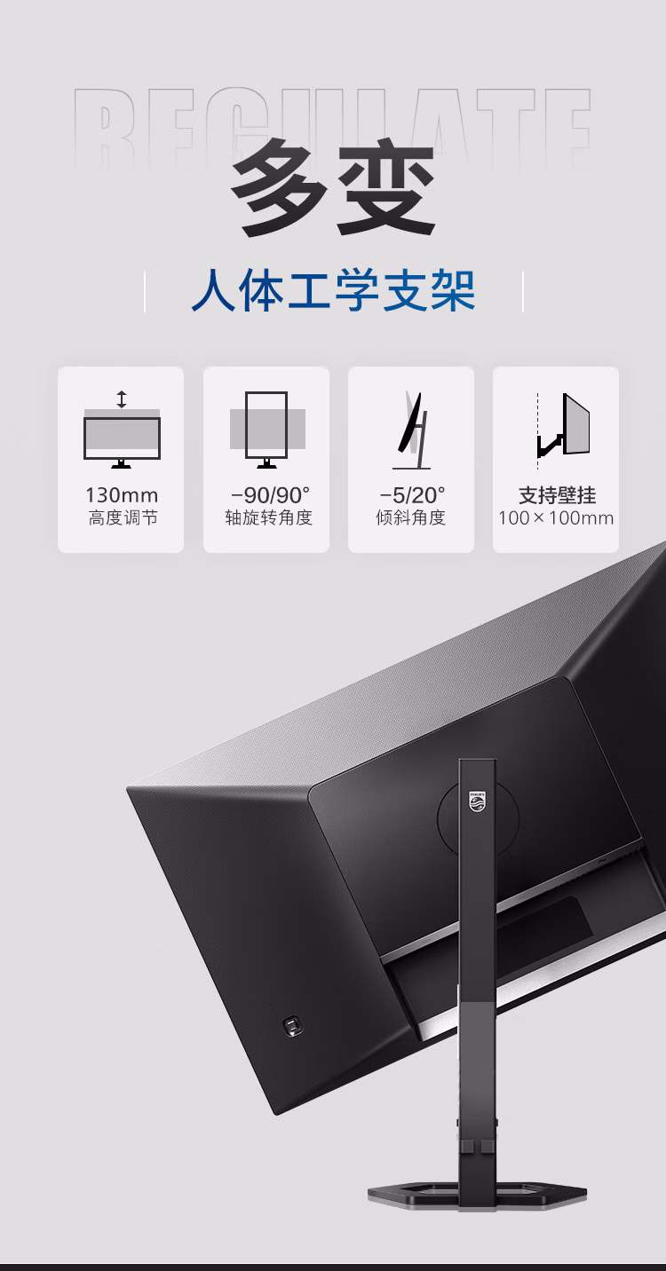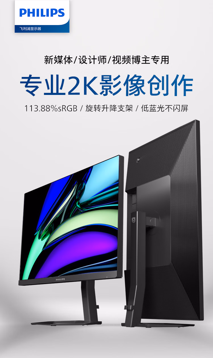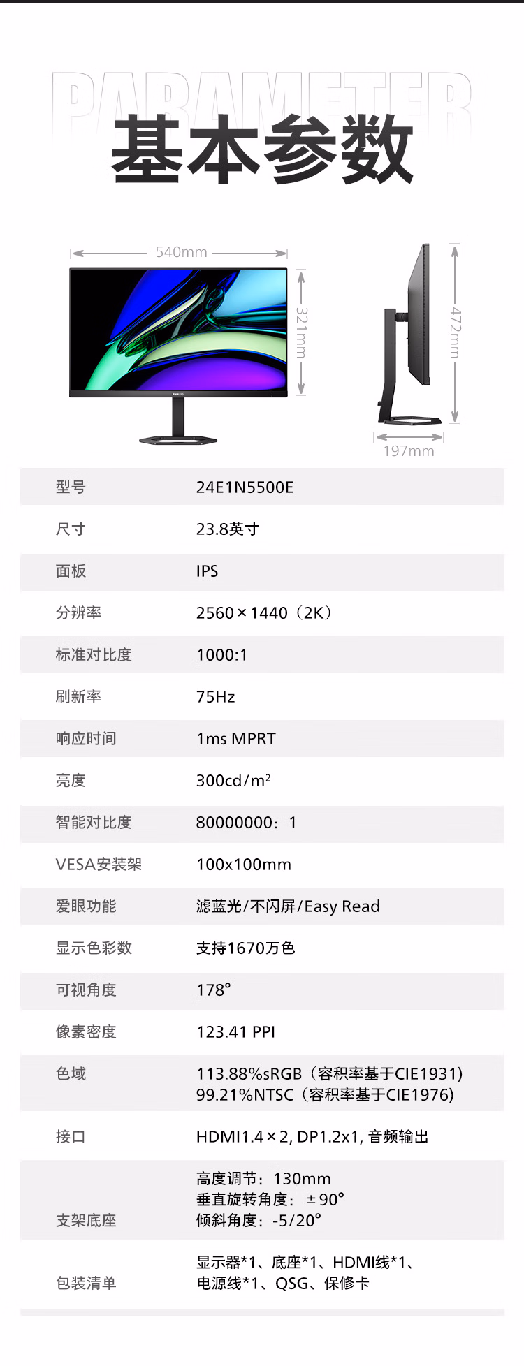 飞利浦 23.8英寸 2K IPS 75Hz 广色域 旋转升降 低蓝光 网课 高清设计 办公显示器 商务电脑显示屏24E1N5500E 自营