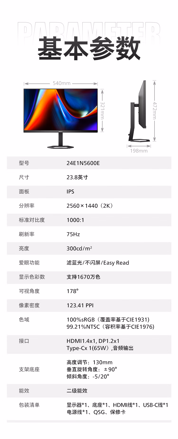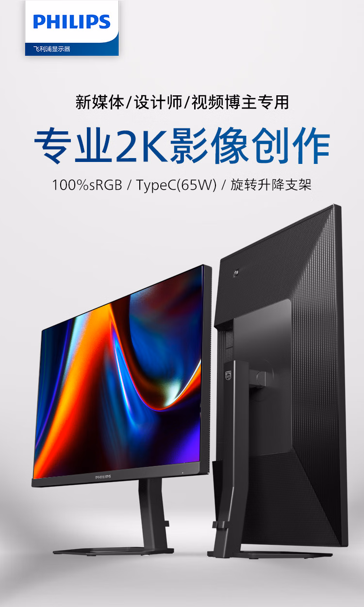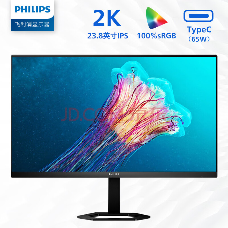 飞利浦 23.8英寸 2K IPS Type-C65W 低蓝光 网课 旋转升降 高清设计 办公显示器 娱乐显示屏 24E1N5600E 自营