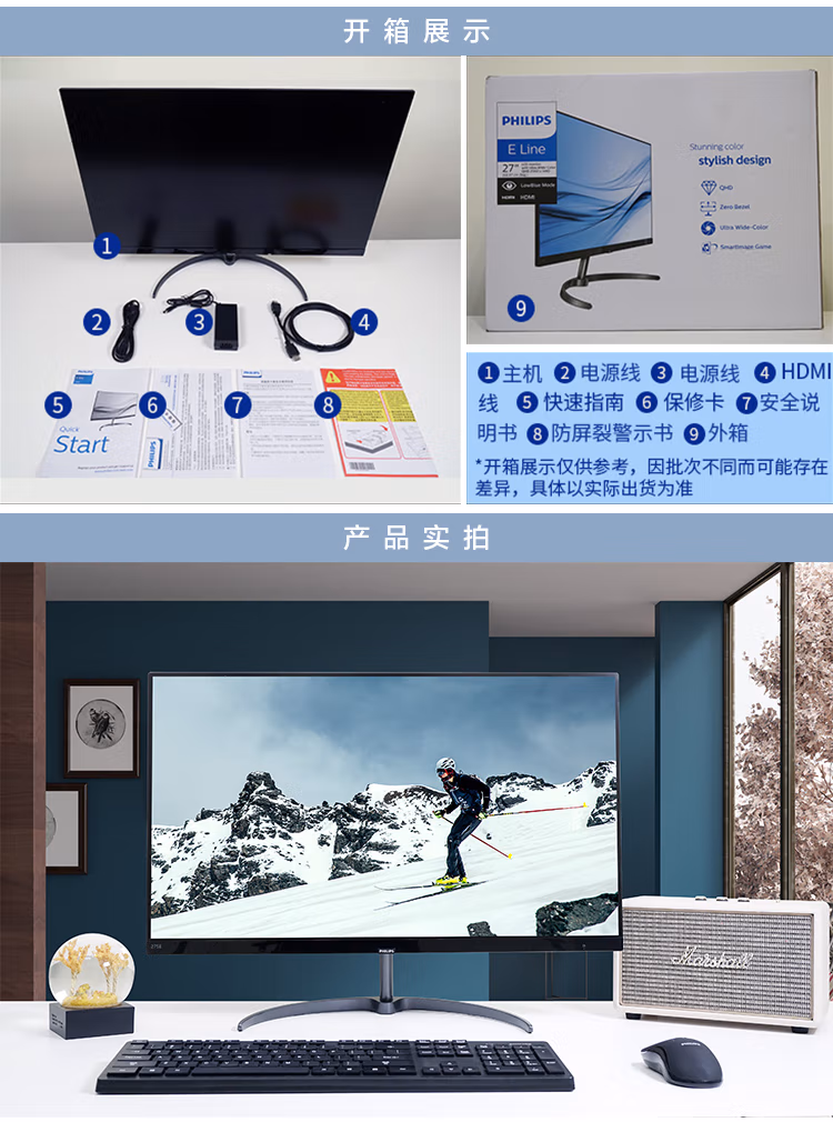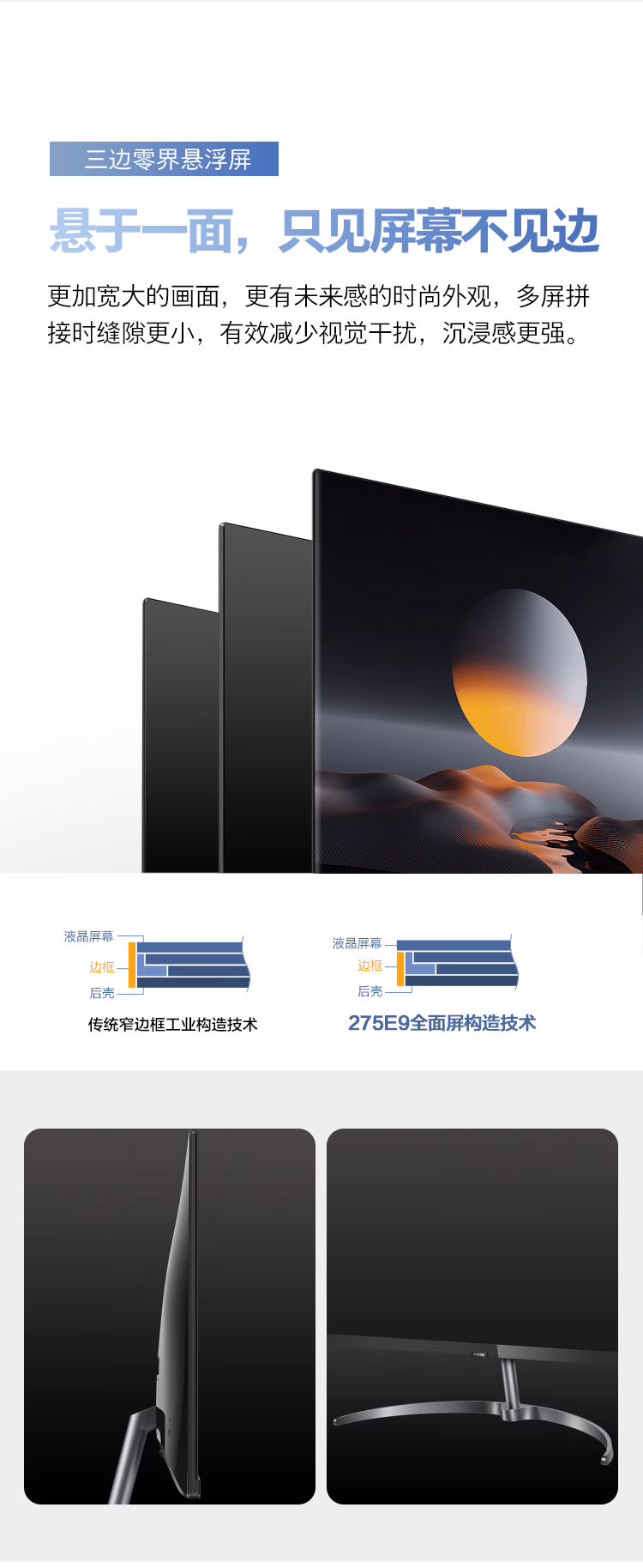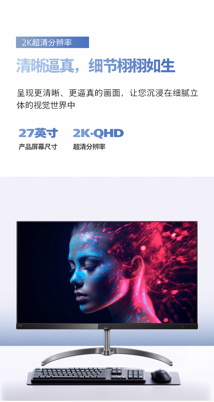 ¥1799.00飞利浦 27英寸 LGD-IPS悬浮全面屏 2K 超薄 75Hz 131%sRGB广色域金属支架底座高清设计娱乐办公显示器 275E9