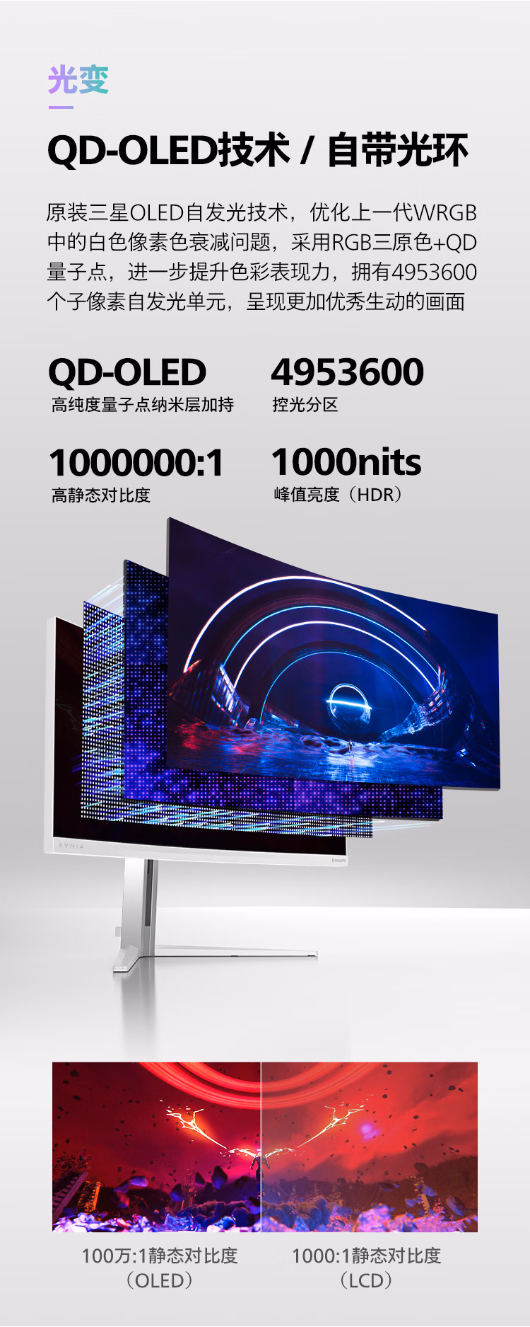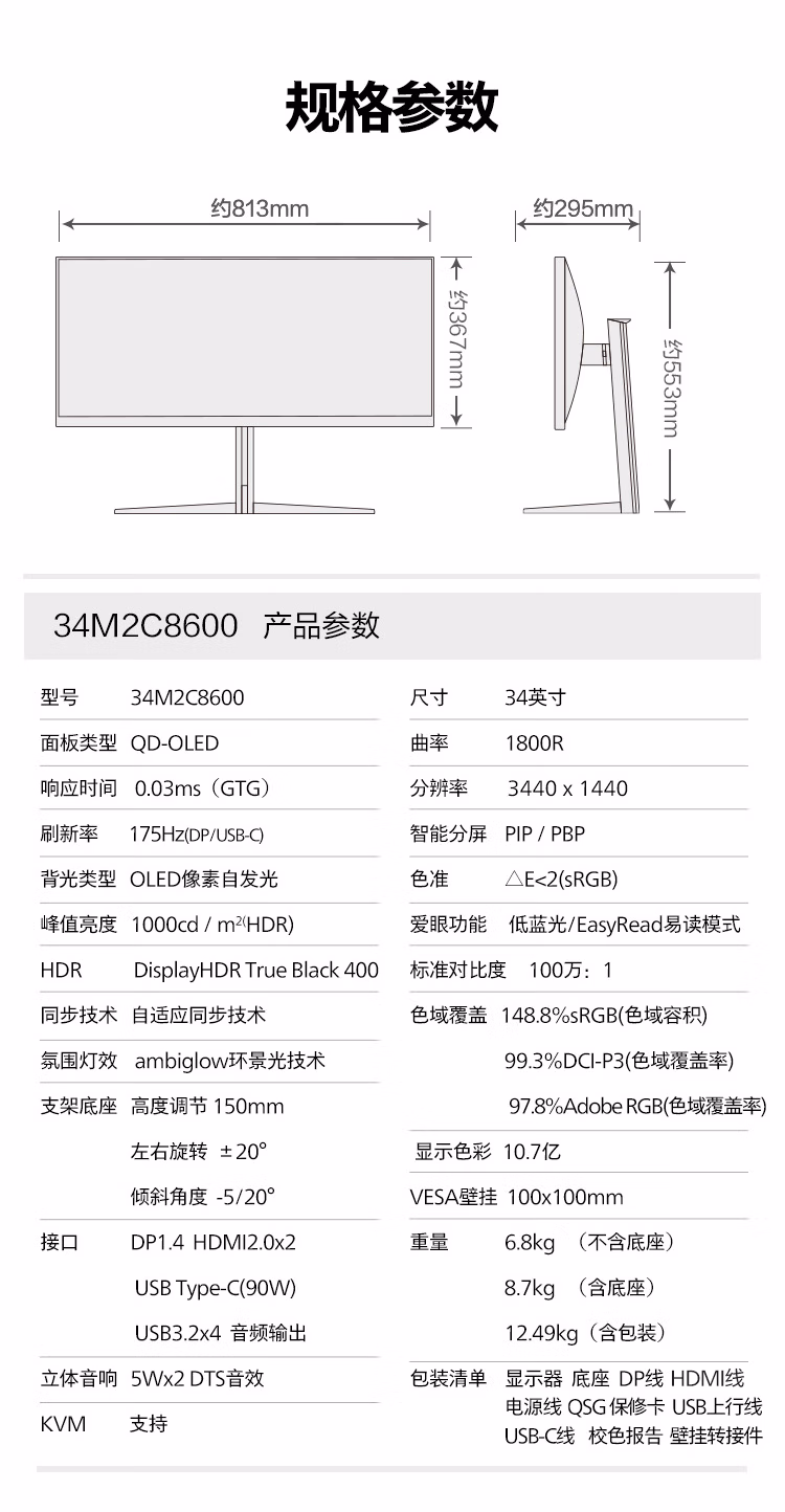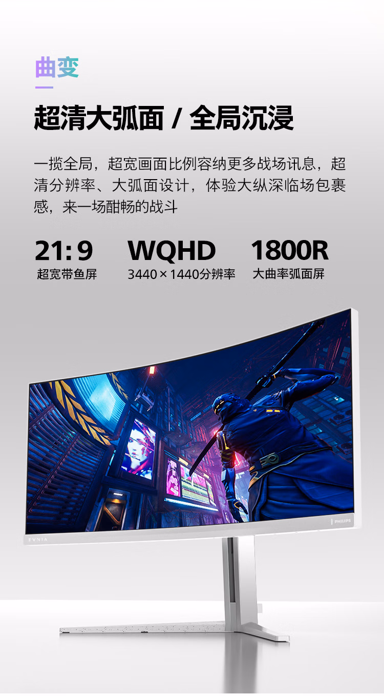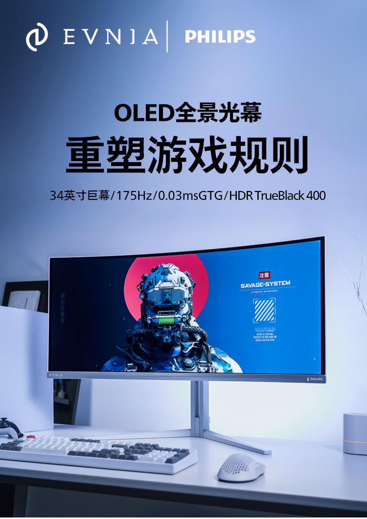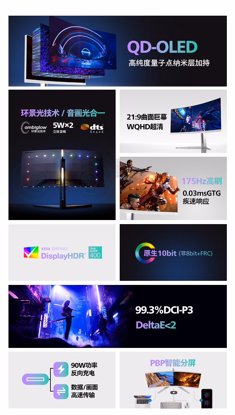 飞利浦 34英寸 防烧屏QD-OLED WQHD曲面带鱼屏 175Hz 0.03ms HDR400 TypeC90W AI氛围光 电竞显示器34M2C8600 自营