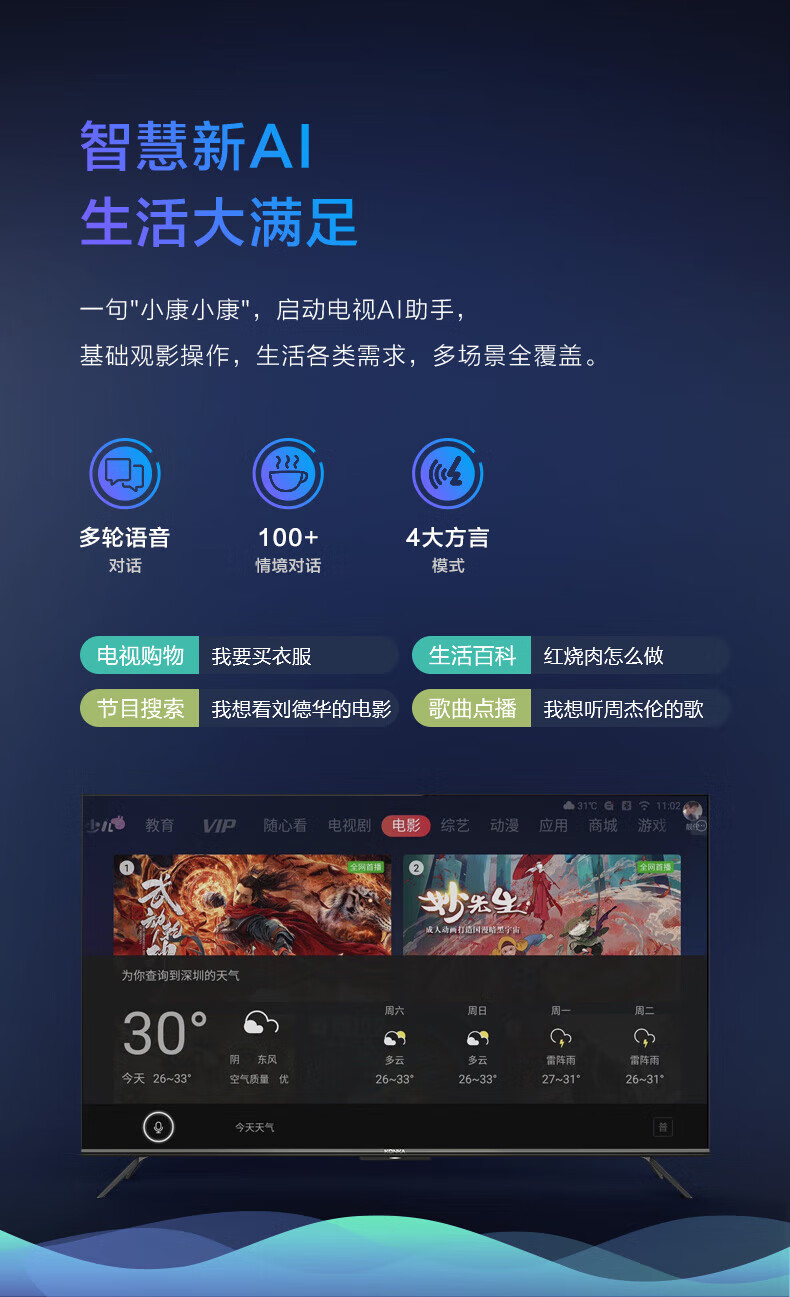 ¥15399.00康佳(KONKA)LED70G30UE 70英寸 4K超高清人工智能2.0智能网络WIFI液晶平板电视