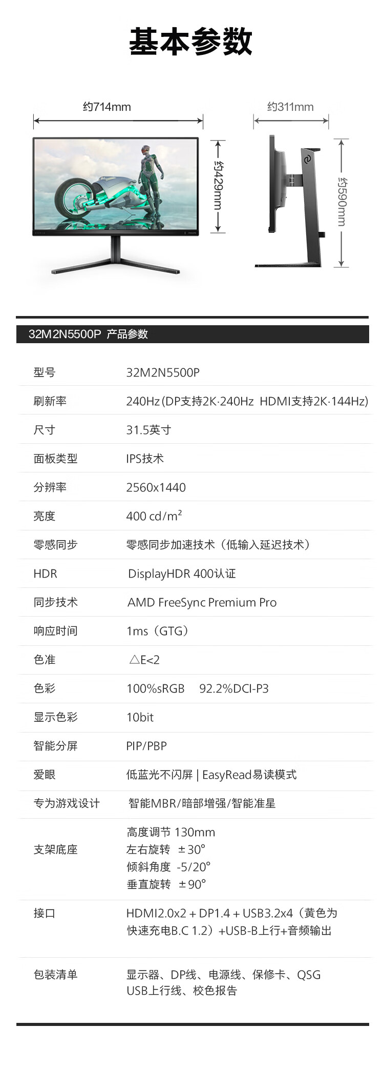 ¥1299.00飞利浦 31.5英寸2KFastIPS 原生240Hz1ms快速液晶 HDR400出厂校准 10bit EVNIA游戏电竞显示器32M2N5500P