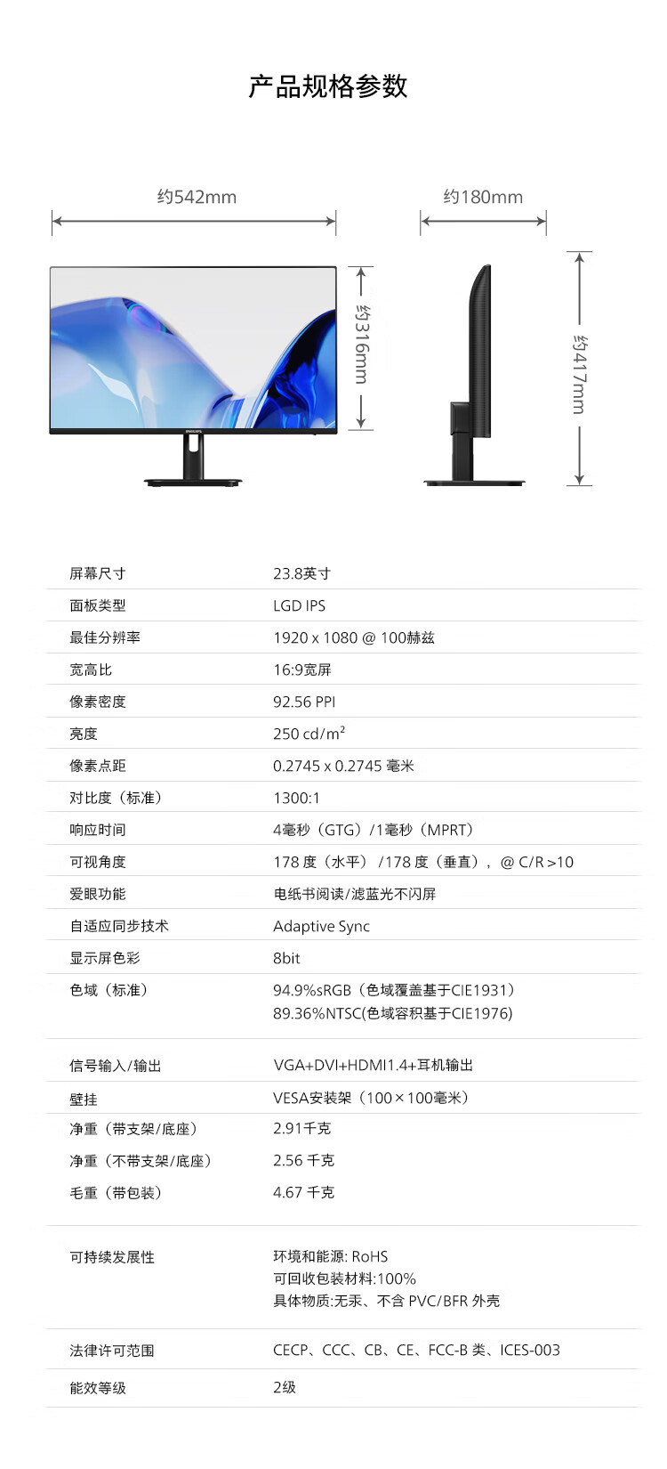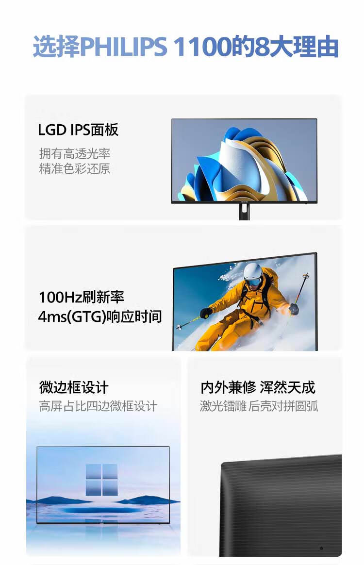 ¥20089.00飞利浦 23.8英寸 2K IPS 75Hz 117%sRGB 低蓝光 HDMI/DP 家用娱乐 游戏模式 高清办公显示器 拼接显示屏245E1