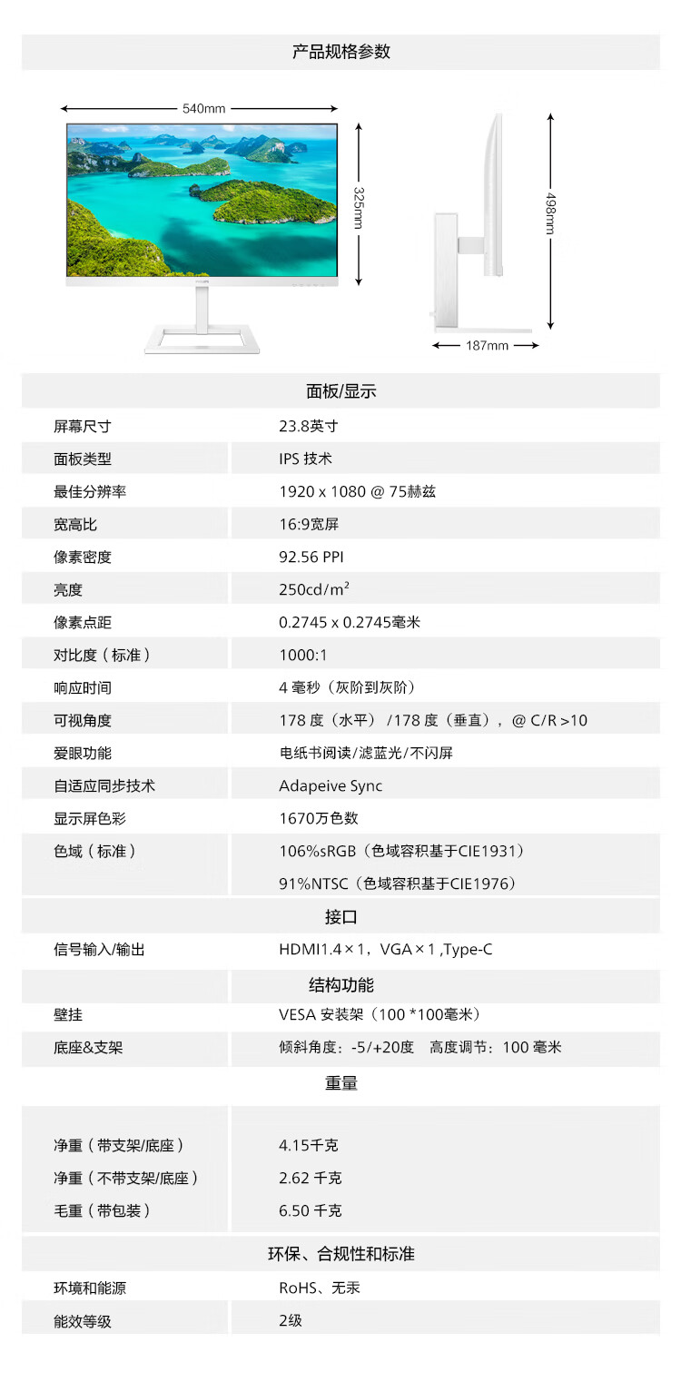 飞利浦 27英寸 4K NanoIPS Black TypeC96W 硬件滤蓝光 10bit HDR400 办公显示器 纤薄全面屏设计27E2F7901