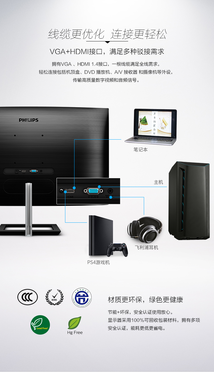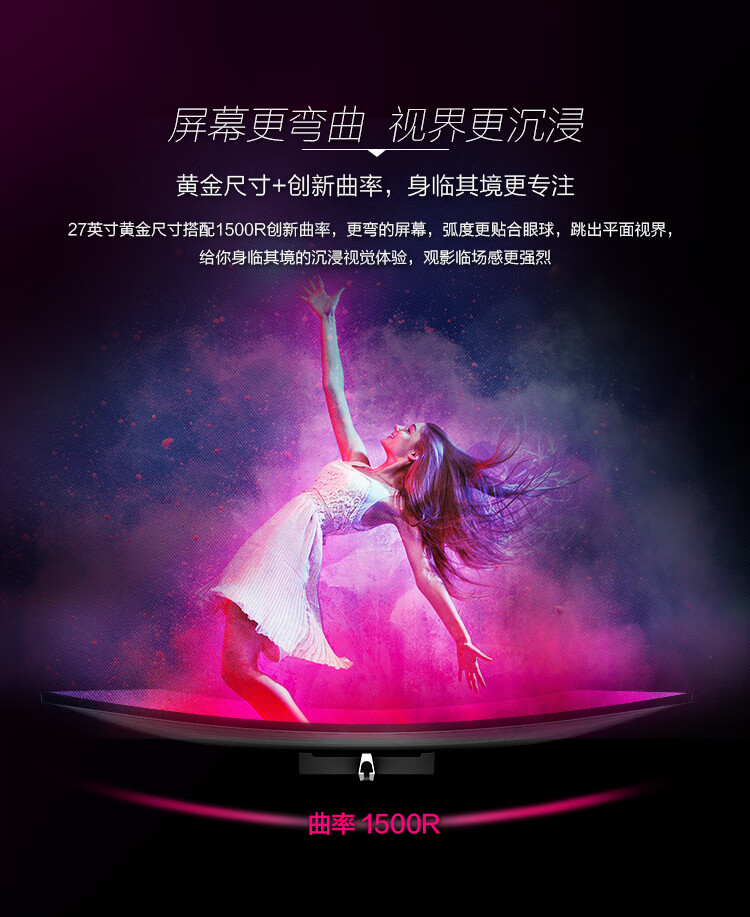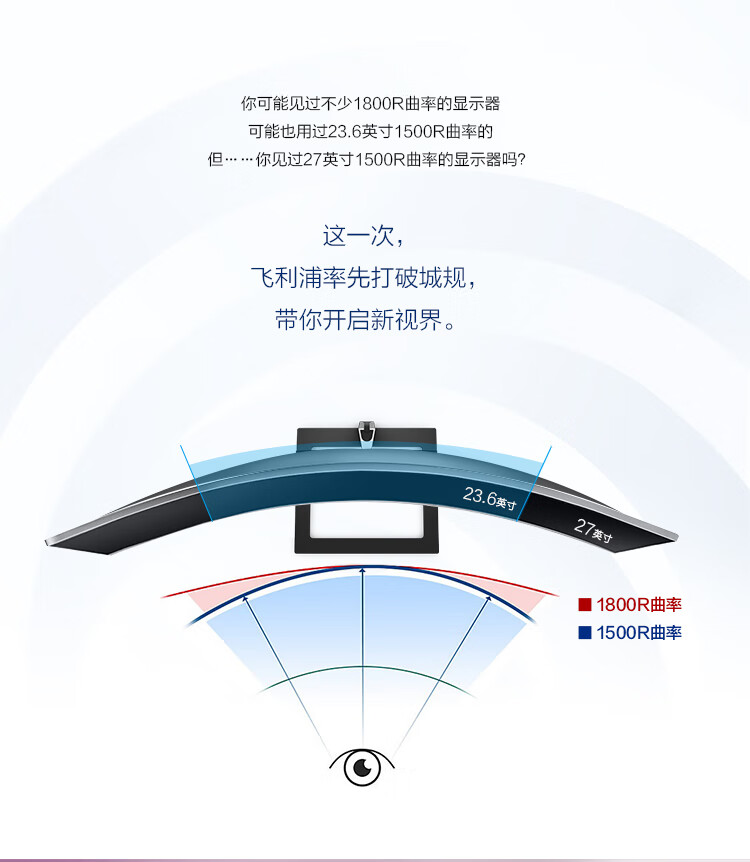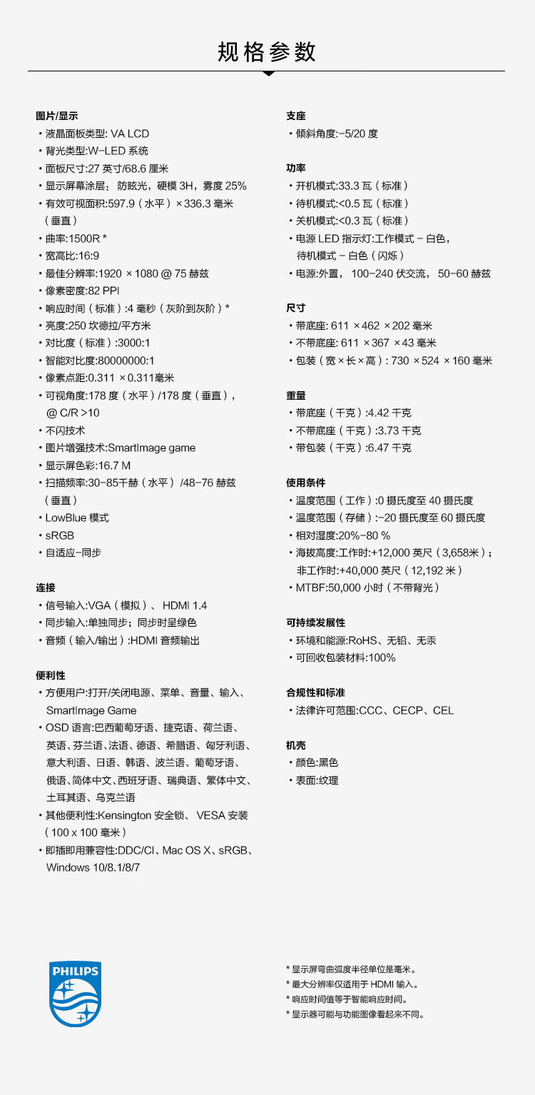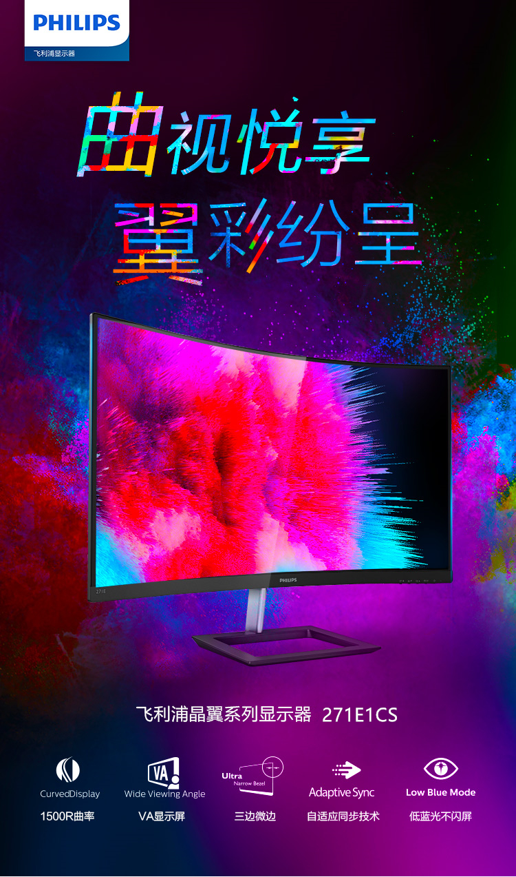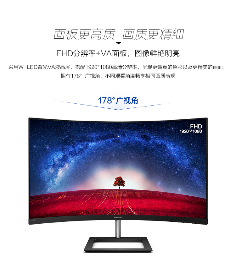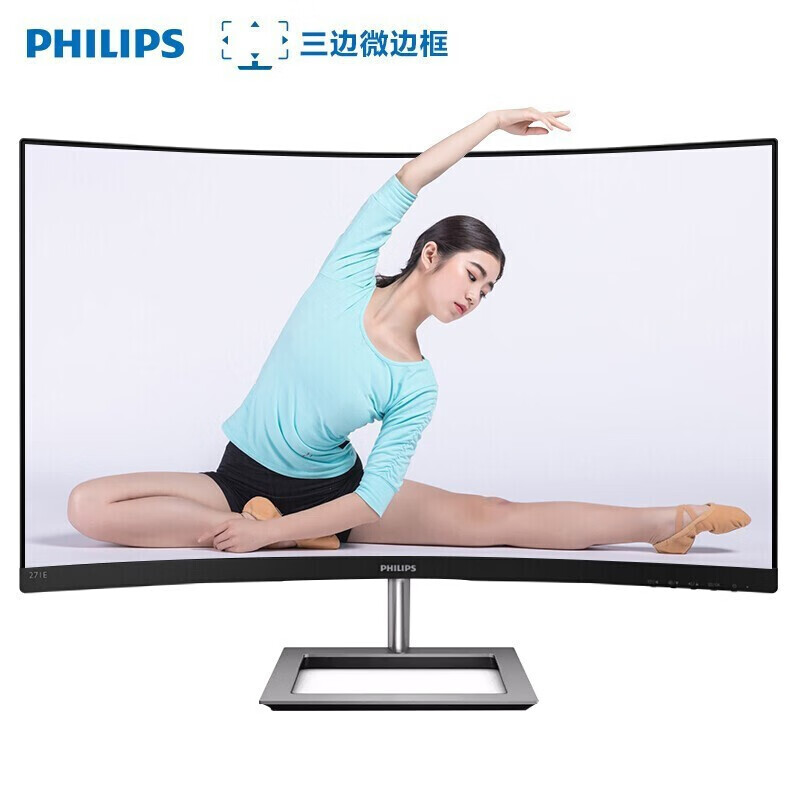 飞利浦 27英寸 曲面屏 1500R 75Hz 全高清 低蓝光 HDMI 金属银底座 网课 办公显示器 娱乐电脑显示屏 271E1CS 自营