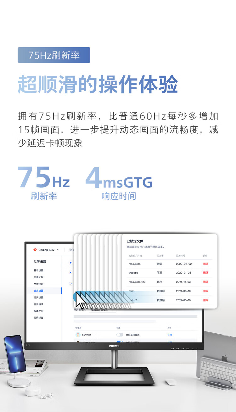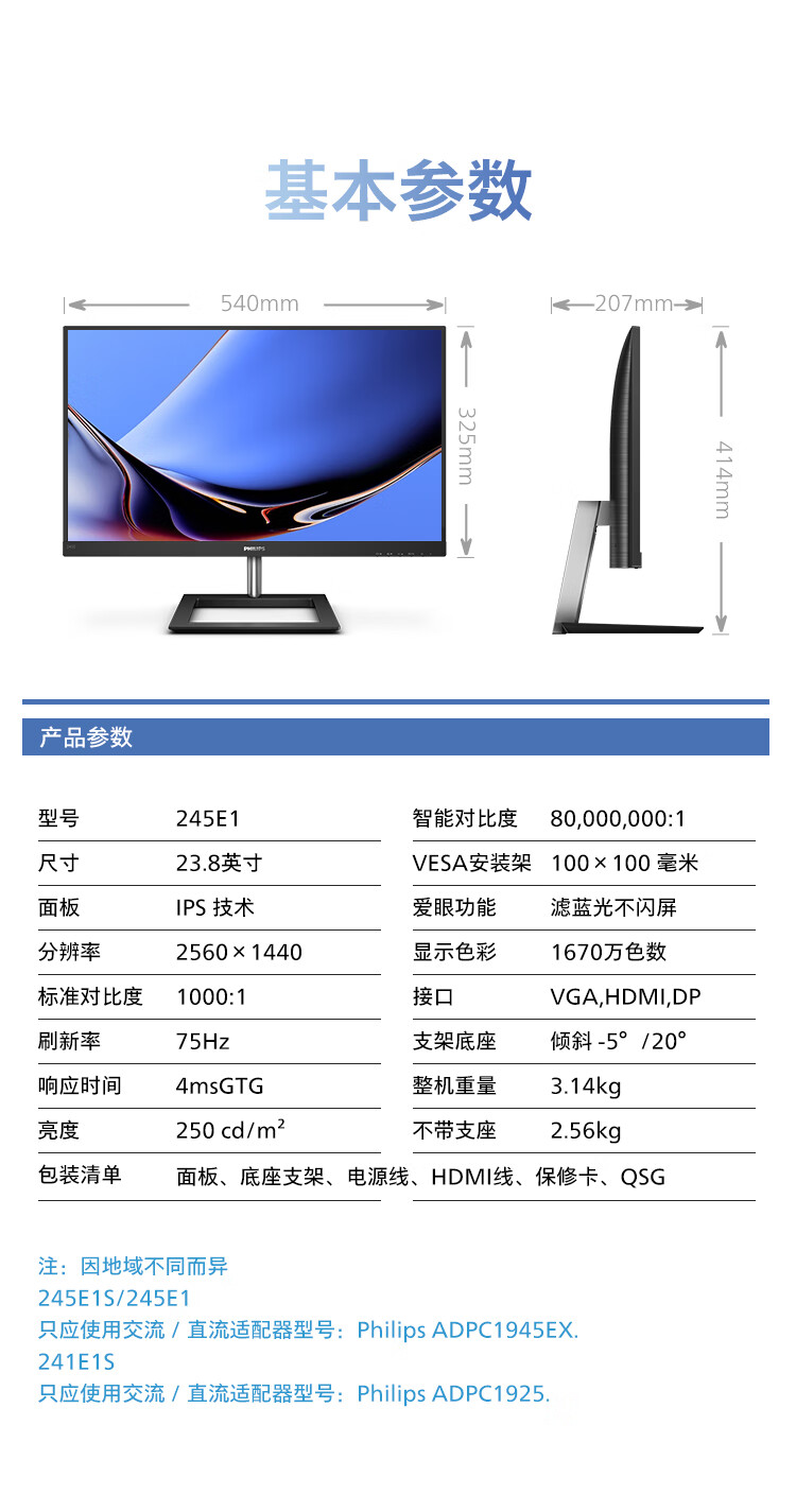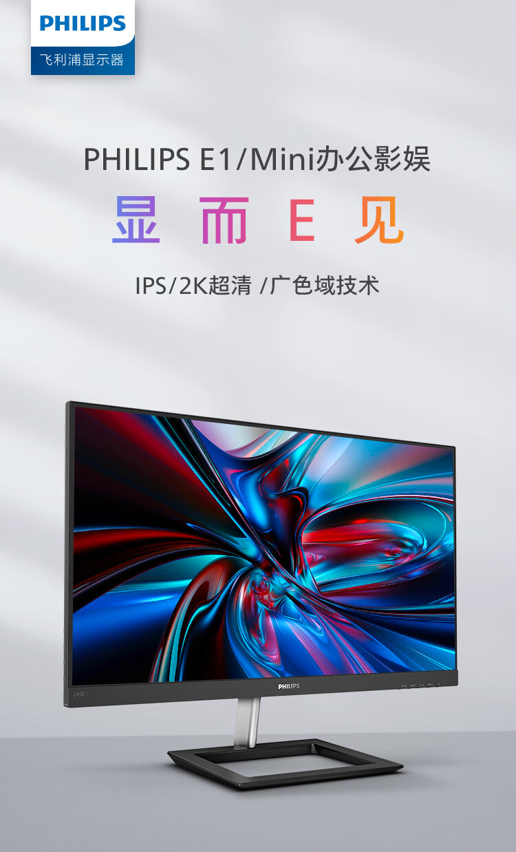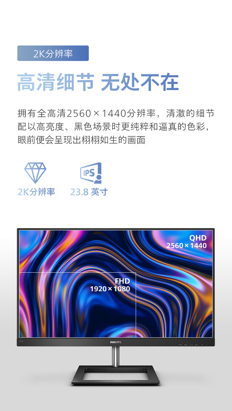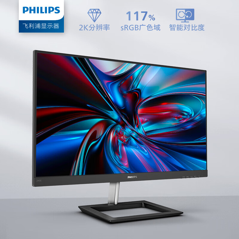 飞利浦 23.8英寸2K IPS75Hz 117%sRGB 低蓝光HDMI/DP 家用娱乐游戏模式 高清办公显示器 拼接显示屏245E1 自营
