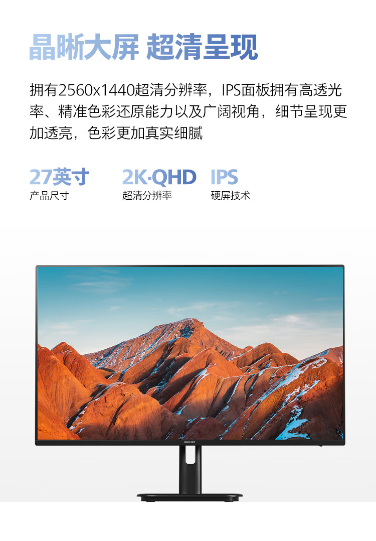 ¥899.00飞利浦 27英寸 4K IPS 10bit Type-C65W 智能分屏低蓝光 旋转升降 专业设计办公显示器 商务显示屏27E1N5900E