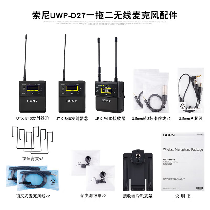 索尼(SONY) 麦克风话筒 Vlog拍摄数码相机外接视频录音 小蜜蜂一拖二 (UWP-D27) 自营
