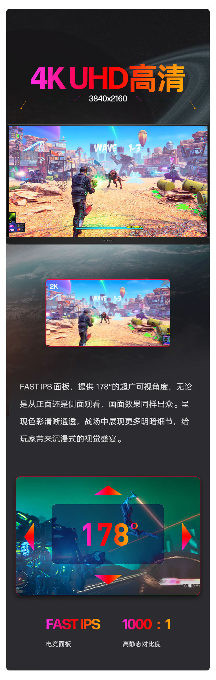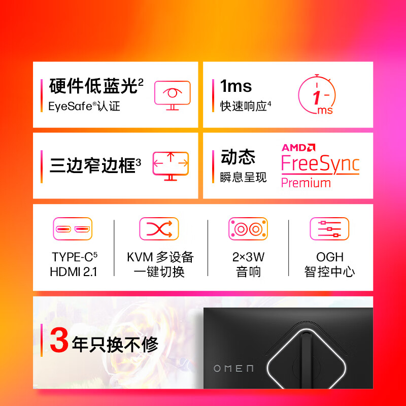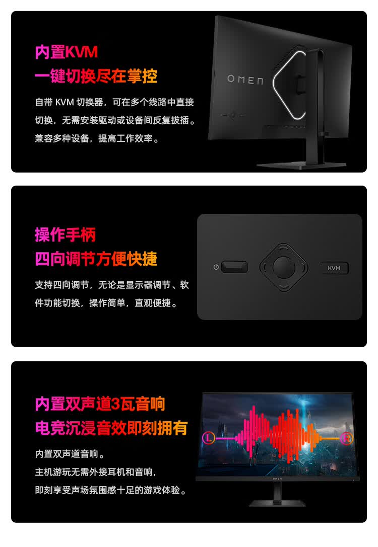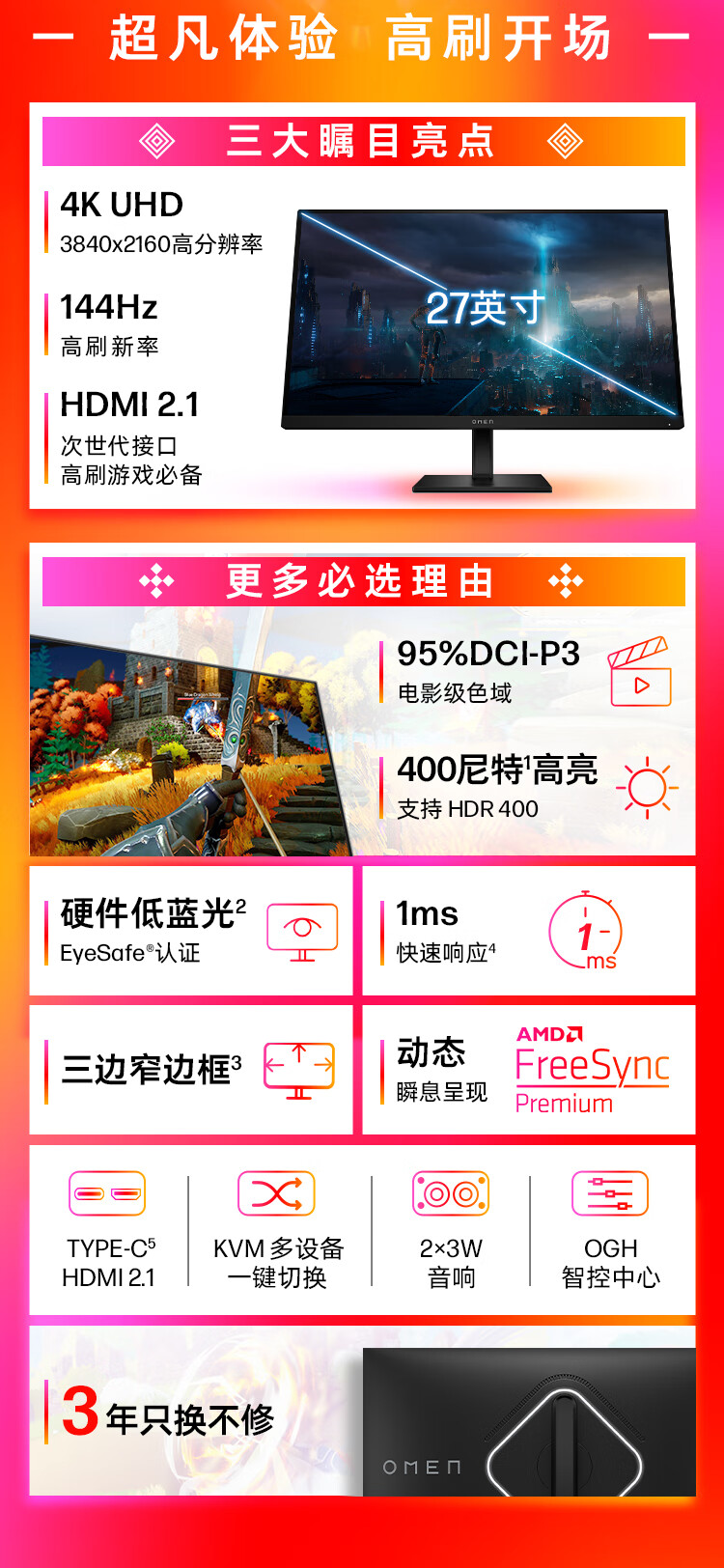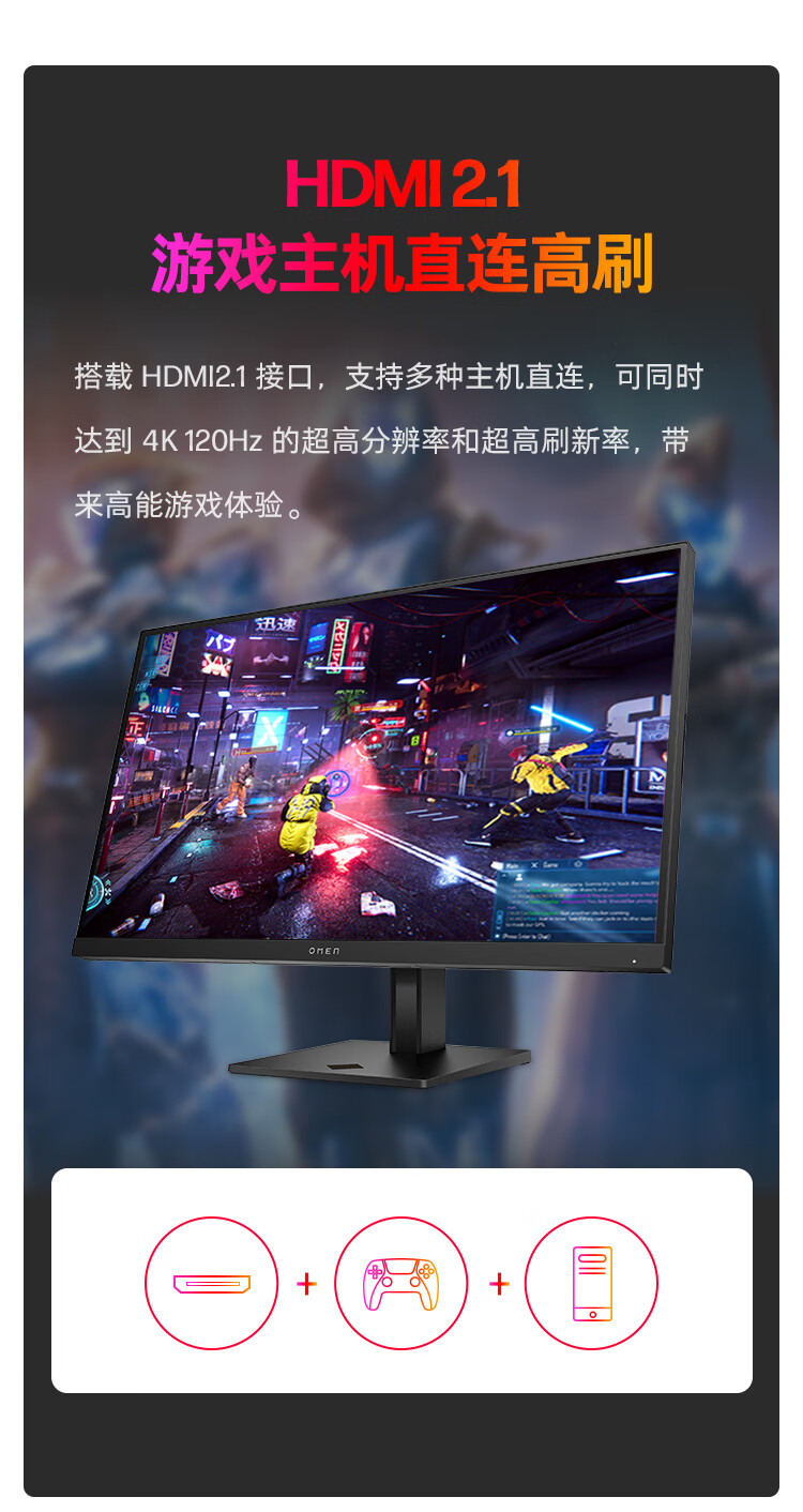 惠普(HP)暗影精灵电竞显示器 27英寸4K UHD 144Hz高刷 FreeSync TUV认证旋转升降电脑显示屏 27k 自营