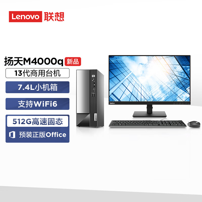 ¥4399.00联想(Lenovo)扬天M4000q 英特尔酷睿i3 商用台式机电脑主机(13代i3-13100 16G 512G SSD wifi Win11)23英寸