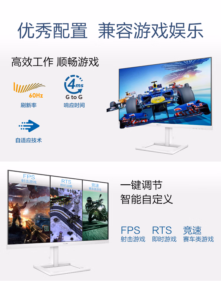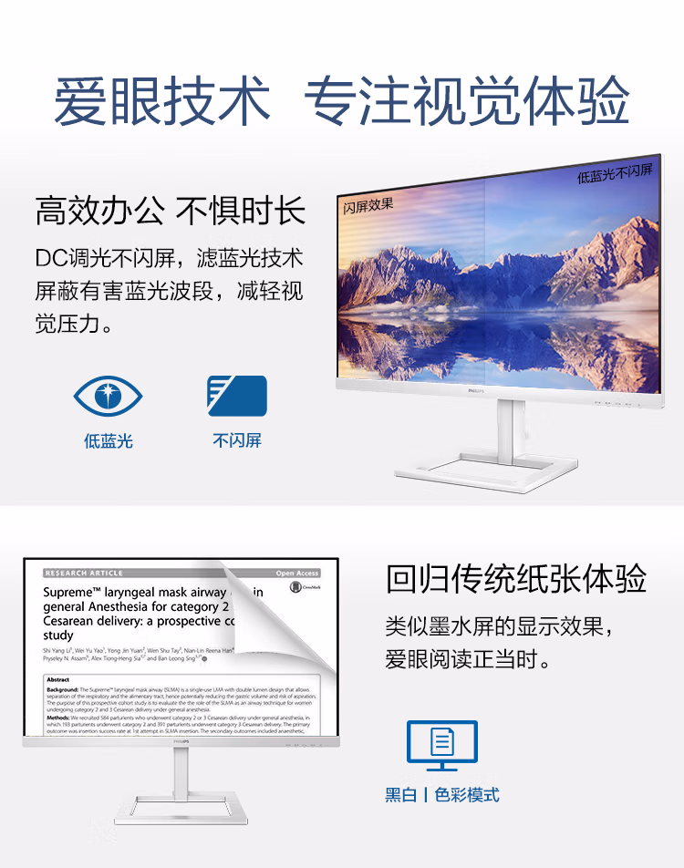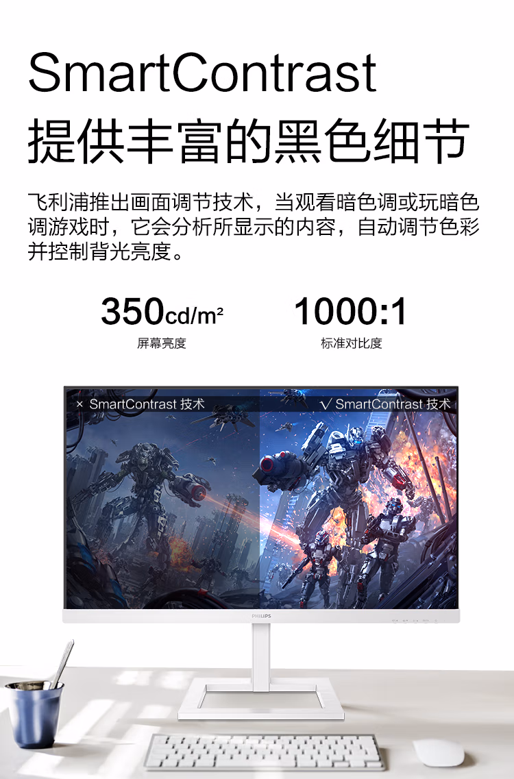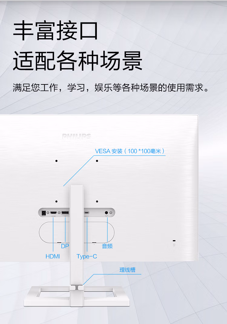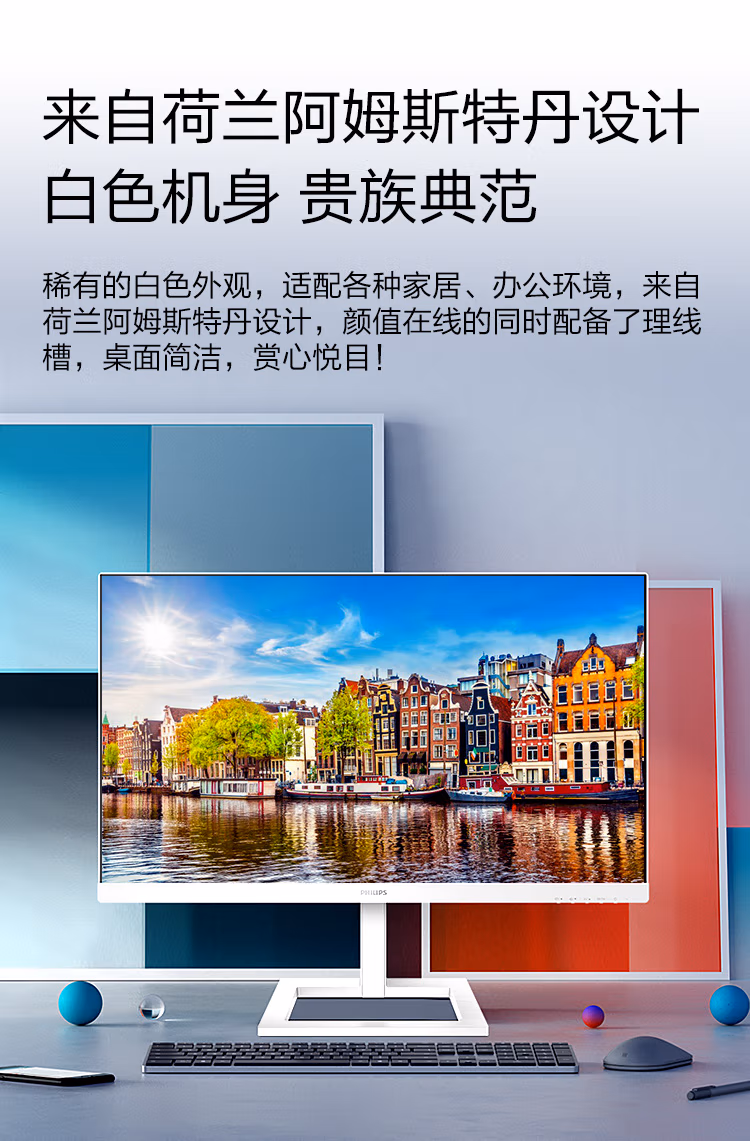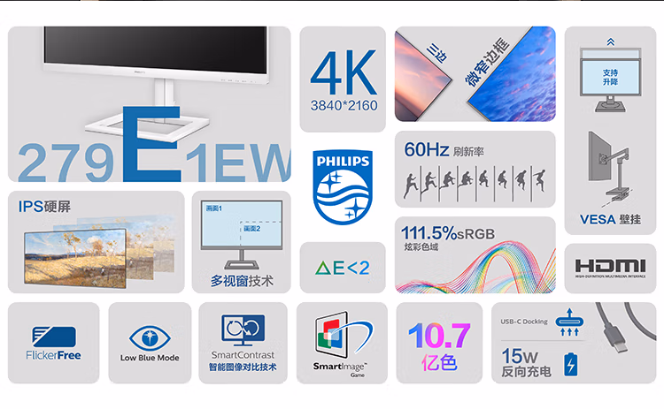 飞利浦 27英寸 4K IPS Type-C投屏 10bit色深 智能分屏 升降 高清设计办公显示器 拼接显示屏 白色279E1EW 自营