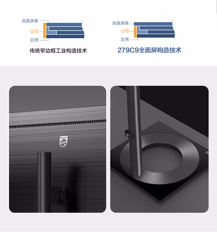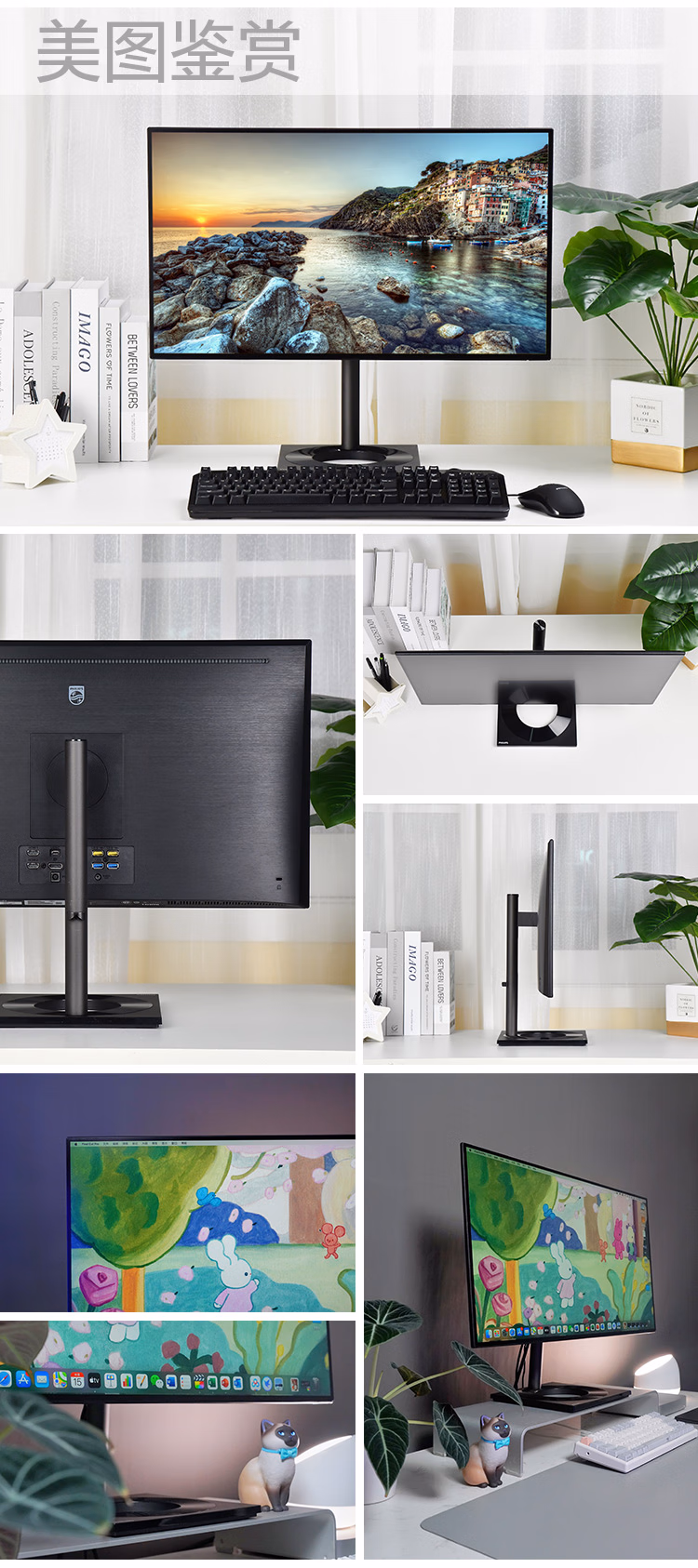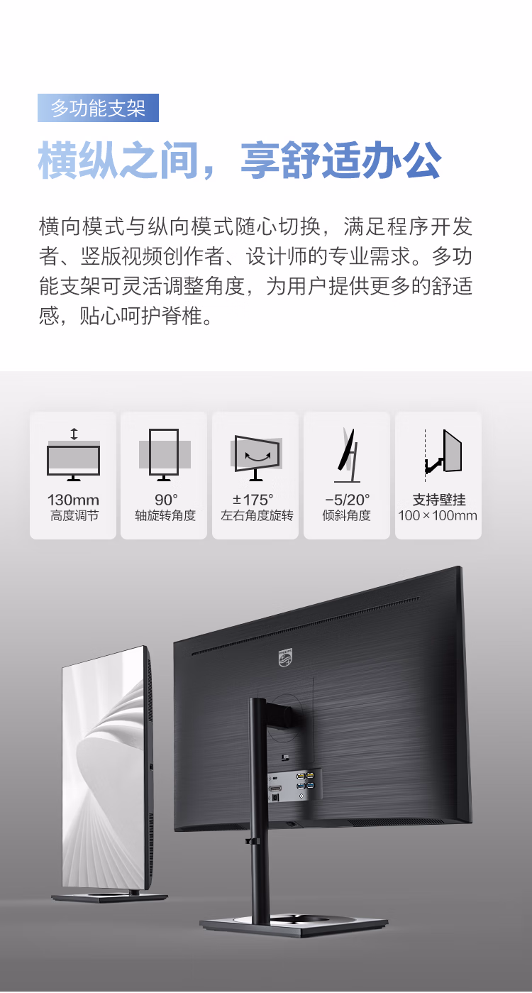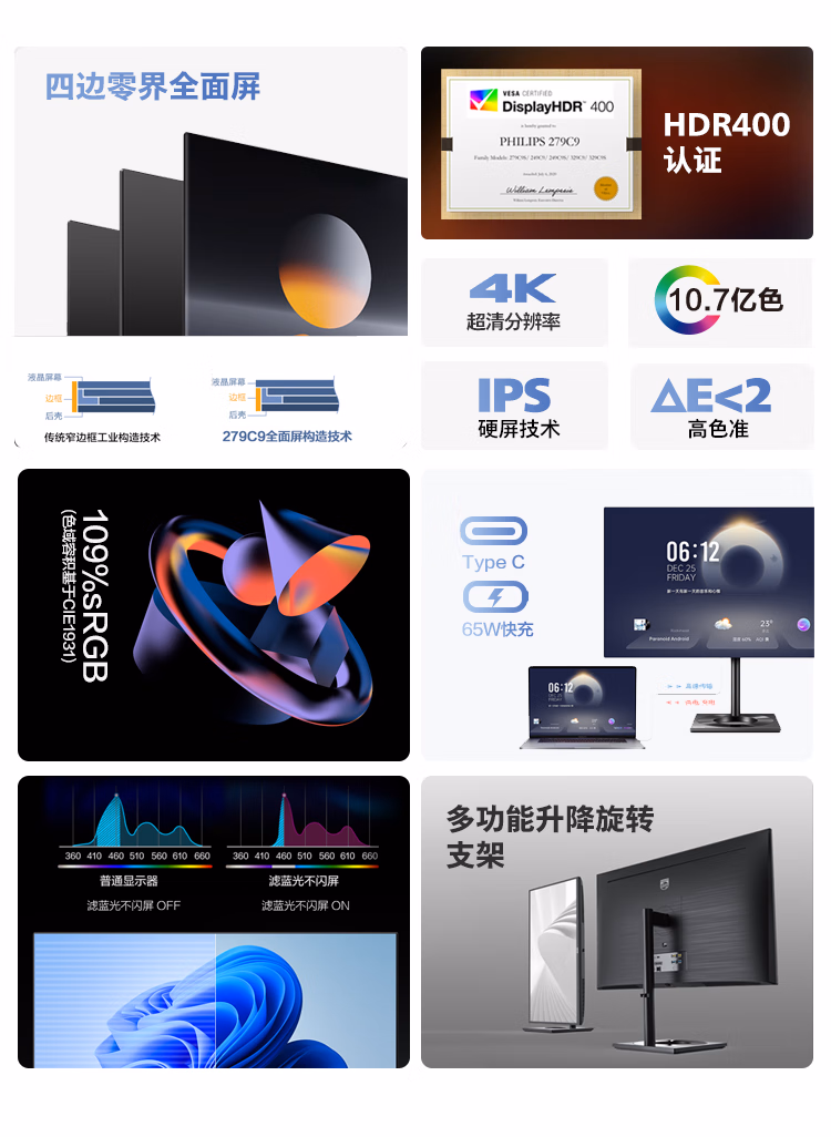 飞利浦 27英寸 LGD-IPS悬浮全面屏 4K 10bit HDR400 Type-C65W 99.9%srgb 旋转升降专业设计办公显示器 279C9 自营